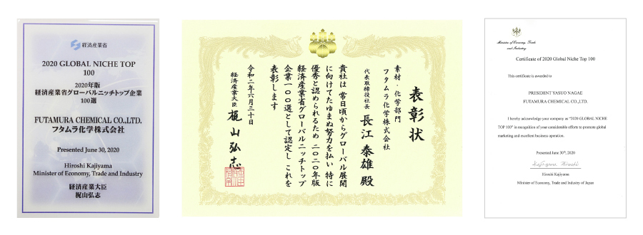 グローバルニッチトップ企業100選とは、 国際市場において極めて高いシェアを確保し良好な経営を実践している企業を経済産業省が認定するもので、定義としては提供する製品サービスの市場規模が100~1000億円で、3年間の内1年でも20%以上(中小企業は10%以上)の世界シェアを確保したことがある企業の中から、収益性・戦略性・将来性・品質などを厳正に審査して選ばれます。前回の2013年度に実施した後、国際情勢の変化に伴い2020年版の新グローバルニッチトップ企業の選定が行われました。その結果、世界市場でトップの地位を築いている企業の中から、 機械・加工部門61社、素材・化学部門24社、電気・電子部門20社、消費財・その他部門8社、の合計113社が受賞しています。